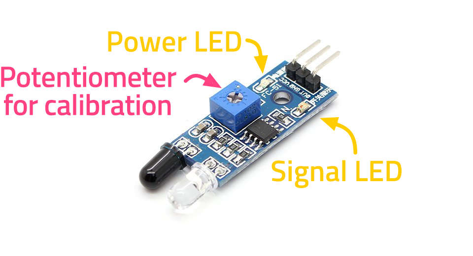 Now, to calibrate your sensor, place an object at least 15cm away from the robot. If the signal LED is OFF, the sensor is working properly. Otherwise gently turn the potentiometer (that tiny blue cube with a screw in it) with a screwdriver in the anti-clockwise direction such that the LED turns OFF.